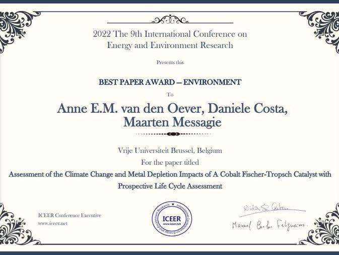 The paper 'Assessment of the Climate Change and Metal Depletion Impacts of a Cobalt Fischer-Tropsch Catalyst with Prospective Life Cycle Assessment' is written by Anne Van den Oever, Maarten Messagie and Daniele Costa.